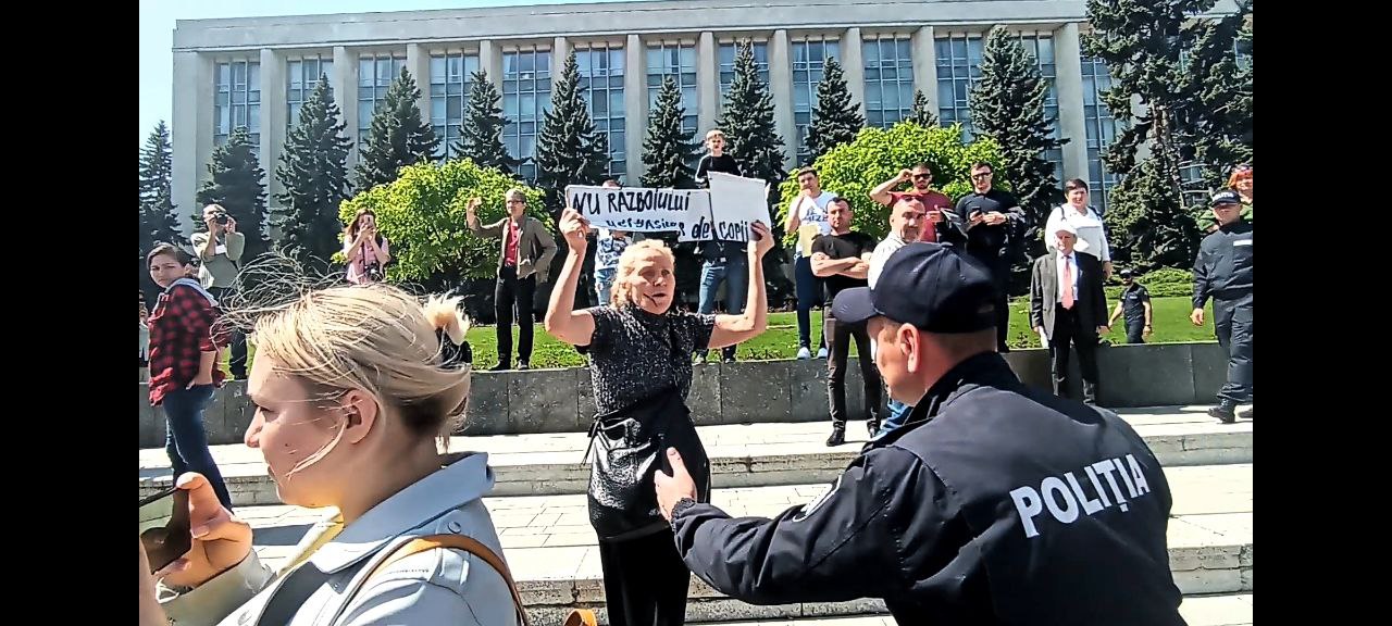 Astăzi, 9 mai 2022, o activistă a ieșit în Piața Marii Adunări Naționale cu mesajul ”Nu Războiului” însă participanții paradei i-au smuls banerul.